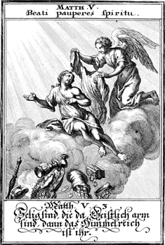 Description: As symbols of riches fall from a cloud, an angel provides a cloak to the poor in spirit as a rendering of the first beatitude: "Blessed are the poor is spirit for theirs in the kingdom of heaven" (NIV).