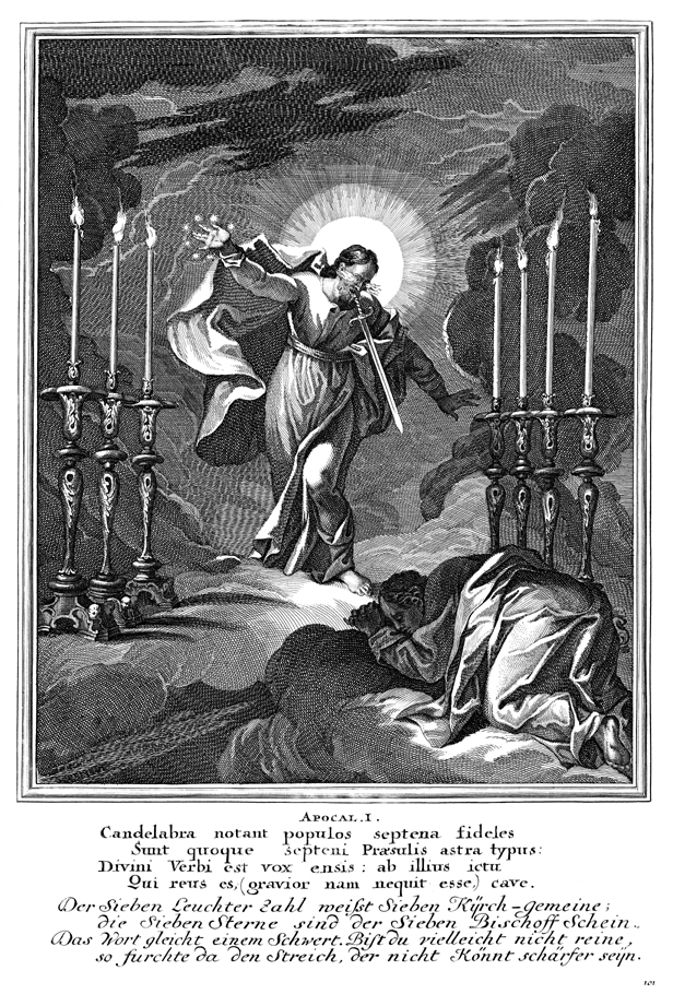 Description: John's vision of the one like the son of man among the seven golden lampstands. John is pictured bowing at his feet.