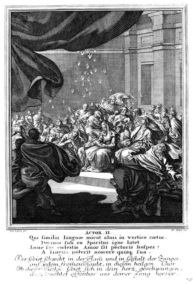 Description: The Holy Spirit, in the form of a flames of fire, descends upon the believers on the day of Pentecost.