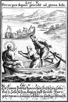 Description: Peter kneels before Jesus in repentance as the other disciples pull in the miraculous catch of fish.