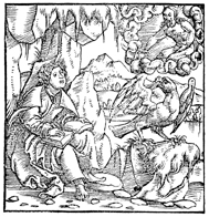 Description: A rendering of John writing his gospel having received inspiration from Jesus, depicted in the cloud. His attribute, the eagle, is nearby.
