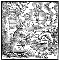 Description: St. John writes his gospel receiving inspiration from the Lord Jesus. His attribute, the eagle, is nearby.