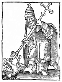 Description: The Pope stables an eagle wearing a crown with the bottom of his cross-shaped staff.