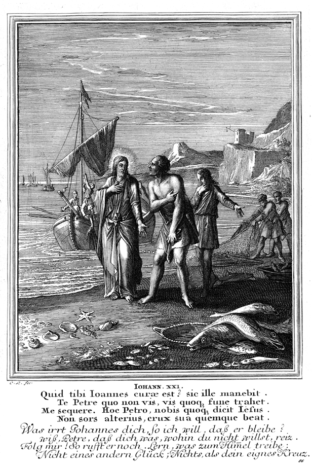 Description: Jesus reinstates Peter while the disciples haul the miraculous catch of fish onto the shore.