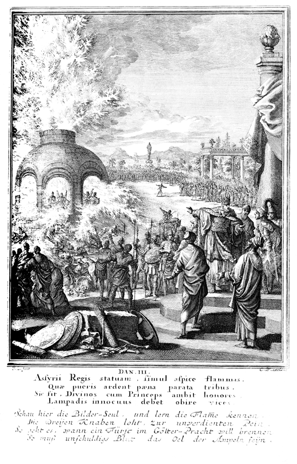 Description: Nebuchadnezzar has Shadrach, Meshach, and Abednego thrown into the fiery furnace for not bowing to the idol, but an angel appears to protect them.
