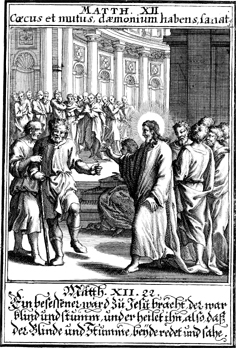 Description: Jesus heals the blind mute in the temple.
