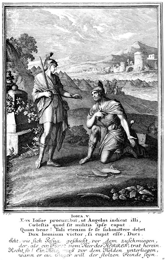 Description: When Joshua meets an angel after crossing into Canaan, he is instructed to remove his sandals, because he is on holy ground.
