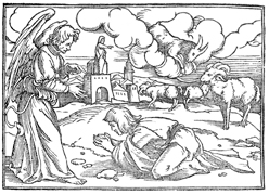 Description: Daniel bows on the ground in prayer before an angel, while in the background is a walled city (Susa) with a figure standing over the gate and pointing toward three rams and a goat coming down from the clouds.