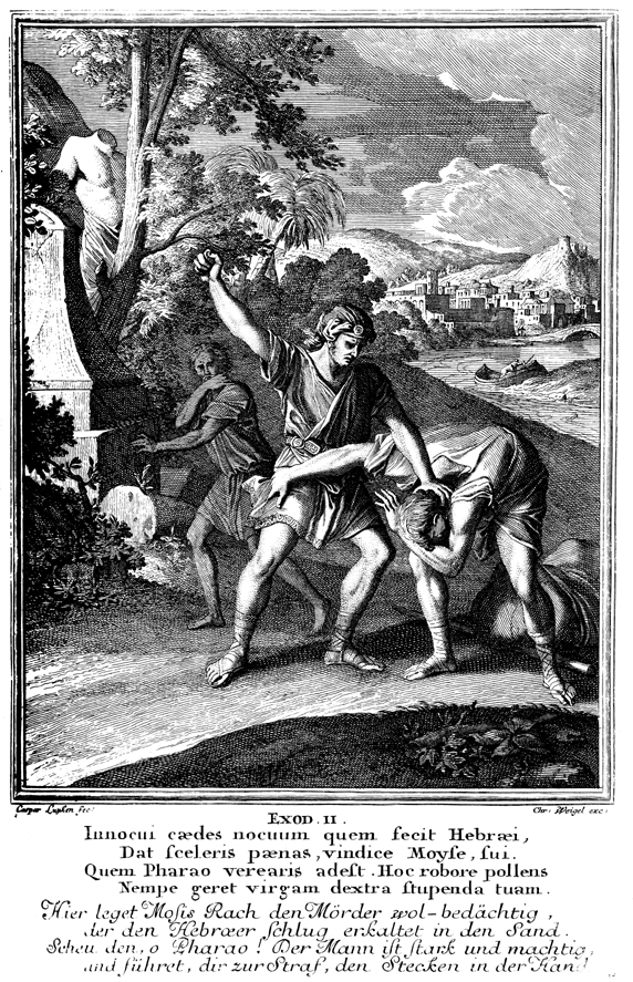 Description: Moses kills an Egyptian for striking a Hebrew slave, as the latter fearfully looks on.