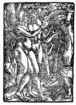 Description: Eve receives from the serpent a piece of forbidden fruit, and in turn shares it with her husband Adam.