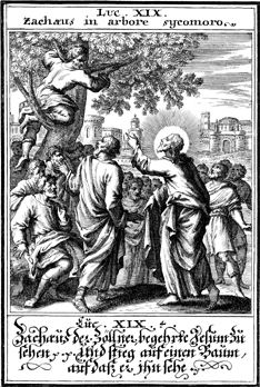 Description: Jesus speaks to Zacchaeus, who has climbed a sycamore tree in order to see Him.