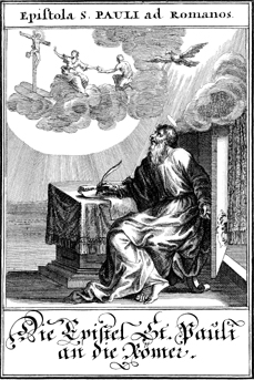 Description: Paul writes his epistle to the Romans as images of the Holy Spirit and the crucifixion appear above.