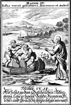 Description: Jesus calls Simon Peter and Andrew at the Sea of Galilee as they fish.