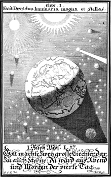 Description: God, represented by a radiating light, places the sun, moon, and stars across the sky as they shine upon the earth on the fourth day of creation. The artist’s initials, I.U.K. (Joann Ulrich Kraus, 1645-1719), appear at the bottom (right), and the engraver’s, G.C.E. (George Christopher Eimart, 1638-1705), at left.
