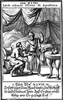 Description: Joseph makes a promise to his father, Jacob that he will bury him in Canaan, and not Egypt.