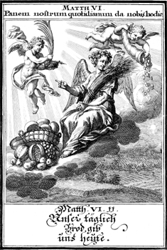 Description: An angel and two putti pour out food upon the earth as a rendering of the petition "Give us this day our daily bread" from the Lord's Prayer.