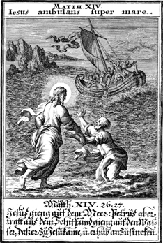 Description: Jesus saves Peter as he begins to sink while walking on water.