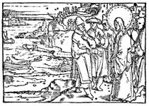 Description: Jesus converses with the Pharisees by the shore.