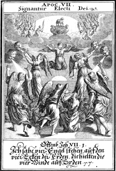 Description: Angels hold the winds of the four corners of the earth back while the 144,000 saints are sealed with the mark of Christ (bottom). The lamb is worshiped while standing on an altar in heaven (top).