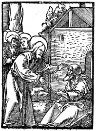 Description: This title-page woodcut of Jesus responding to a beggar introduces Luther's pamphlet on preparation for death.