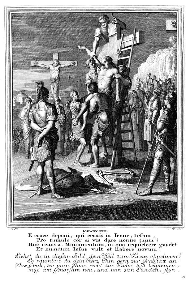 Description: Jesus is taken down from the cross, by Joseph of Arimathea, after his death.