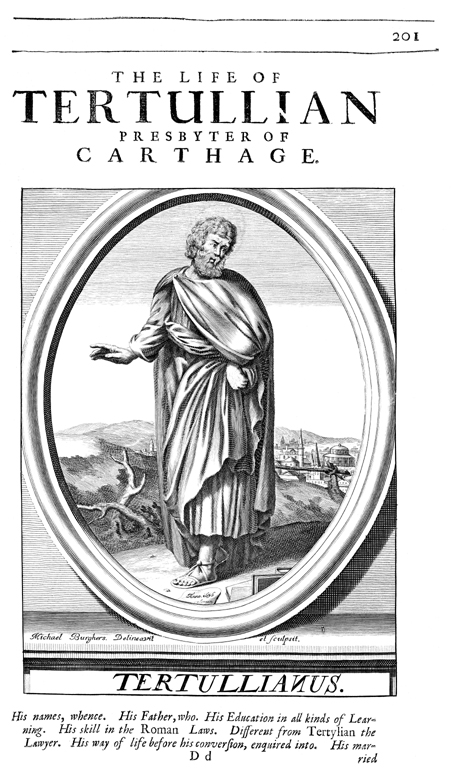 Description: Artist Michael Burghers shows Tertullian standing before Carthage.