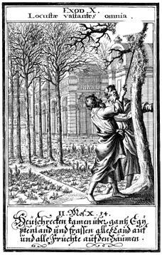 Description: Moses with Aaron alongside brings a plague of locusts on Pharaoh and the Egyptians that destroys all vegetation.