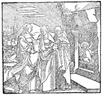 Description: In the foreground an angel tells the women who have come to the tomb (Mary Magdalene, Mary the mother of James, and Salome, Mark 16:1-8) that Jesus has risen from the dead, while in the background Jesus appears as the gardener to Mary Magdalene (John 20:14-17), and Peter and the beloved disciple are shown making their way to the tomb (John 20:3-9).