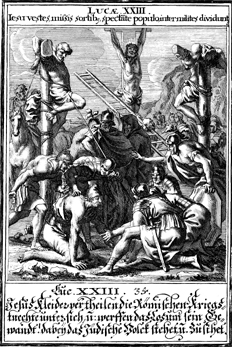 Description: Jesus is crucified between two criminals while soldiers cast lots for his clothes.