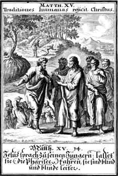 Description: The disciples confront Jesus about offending the Pharisees. he says to leave them because they are like blind leading the blind. In the background, the result of the blind leading the blind is illustrated as one falls into the pit.