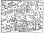 Description: Three women open a basket as God looks on from heaven.