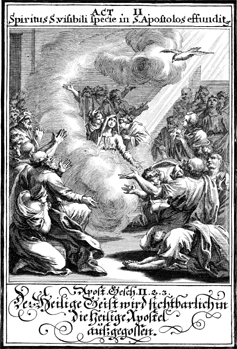 Description: The Holy Spirit descends upon the believers in the form of a dove on Pentecost.