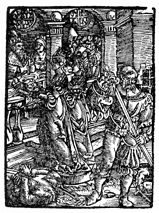 Description: John the Baptist in decapitated as Herod and Herodias sit at a table in the background.