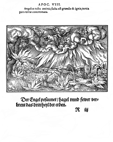 Description: An angel sounds the first trumpet, bringing hail mixed with fire and blood upon the earth. The artist, Virgil Solis (1514-1562), has placed his monogram on a stone in the lower right of the woodcut, and at the lower left is 21 + and an engraver’s knife.