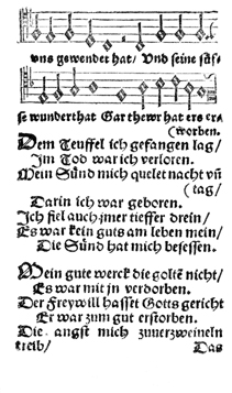 Description: Music and lyrics to a hymn in Martin Luther’s collection of hymns for use in Wittenberg.