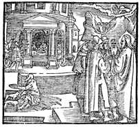 Description: Lazarus sits at the gate of the rich man, who lives in luxury. In the rear, the rich man begs Abraham to allow Lazarus to put water on his tongue to quench his torment.