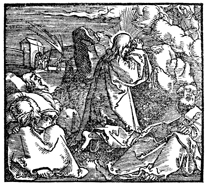 Description: Jesus prays in the Garden of Gethsemane that his cup may pass as the disciples sleep. The soldiers arrive to arrest Jesus in the background.