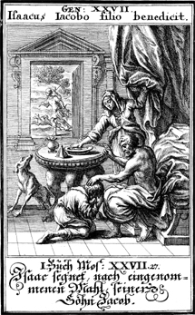 Description: Rebekah helps Jacob fool his father, Isaac, into giving him Esau’s blessing, while Esau is away hunting game (background).