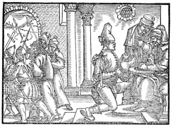Description: Pilate washes his hands of guilt as Jesus is led away to be crucified. Illustration by Pierre Eskrich (ca. 1550-ca. 1590).