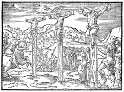 Description: Jesus is crucified between two thieves while the crowd looks on. Illustration by Pierre Eskrich (ca. 1550-ca. 1590).
