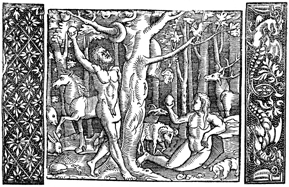 Description: Eve takes a piece of forbidden fruit to share with her husband Adam, as the nearby serpent tempts them.