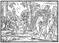 Description: This illustration by Pierre Eskrich (ca. 1550-ca. 1590) depicts three angels guarding the path to the tree of life after Adam and Eve have been expelled from the Garden of Eden for partaking of the forbidden fruit.