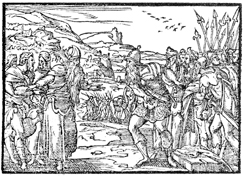 Description: Abram gives Melchizedek, king of Salem, a tenth of everything from the spoils of war, and Melchezedek gives Abram and his forces bread and wine. Illustration by Pierre Eskrich (ca. 1550-ca. 1590).