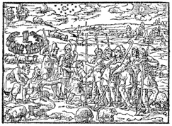 Description: Joseph motions towards images that represent his two recent dreams. In the first dream, his brother’s eleven sheaves of grain gather around his and bow before it (left). In the second dream, the sun, moon, and eleven stars all bow before him (above). Illustration by Pierre Eskrich (ca. 1550-ca. 1590).