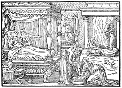 Description: Joseph’s wife (Asenath) looks on as her maidservants care for her two newly born sons, Manasseh and Ephraim. Illustration by Pierre Eskrich (ca. 1550-ca. 1590).