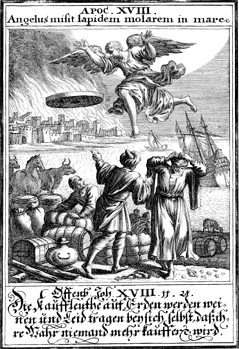 Description: An angel drops a giant millstone, as Babylon (Rome) is destroyed burns in the background.