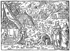 Description: The Israelites gather quail as it falls from heaven. Illustration by Pierre Eskrich (ca. 1550-ca. 1590).
