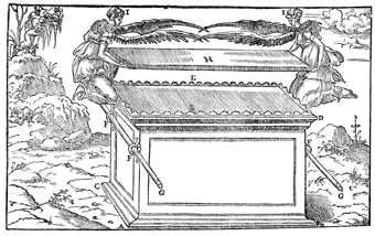 Description: The Ark of the Covenant with two poles made from acacia wood and two cherubim made of gold. Illustration by Pierre Eskrich (ca. 1550-ca. 1590).