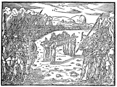 Description: The Israelites cross the Jordan River as the priests hold the Ark of the Covenant in the middle of the river. Illustration by Pierre Eskrich (ca. 1550-ca. 1590).