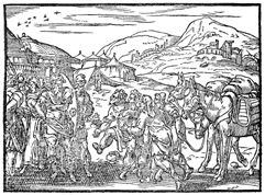 Description: Gibeonite representatives appear before Joshua, pretending to have come from a great distance, and successfully negotiate a peace treaty with Israel. Illustration by Pierre Eskrich (ca. 1550-ca. 1590).